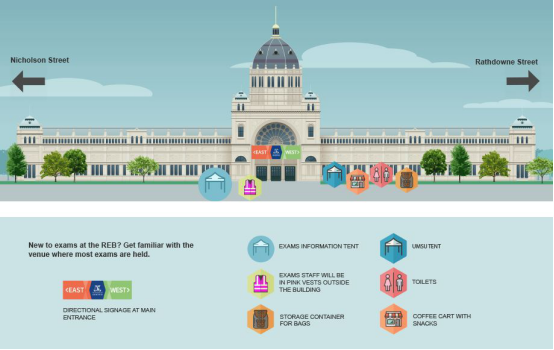 请大家仔细查看自己的考点位置。如果你的考试场地是 Royal Exhibition Builing ,那么你可以先熟悉一下它的外部和内部地图哦!