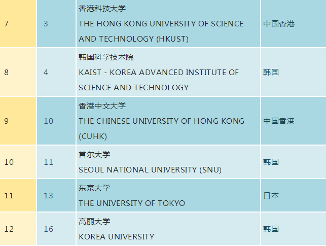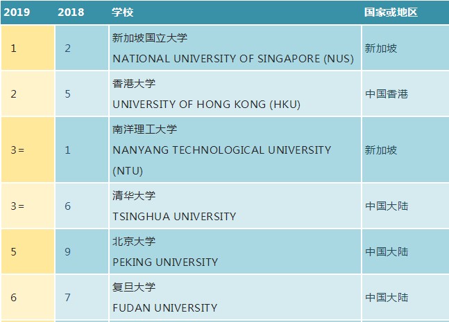 相较去年,今年的榜单发生较大变化,新加坡国立大学上升一位,再次回归第一,去年排在第五的香港大学回归第二。南洋理工大学和清华大学并列第三。北京大学和复旦大学则分列第五和第六。