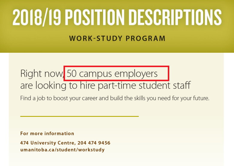 作为曼省最好的大学, 曼尼托巴大学为在校学生提供 勤工俭学的机会 。 学生就业方向 包括植物生物技术专家、食品检验员、动物营养师 , 政府部门商贸处 等 等 。 有 250 家的农业公司总部就设立在曼尼托巴, 就业机会广阔 。