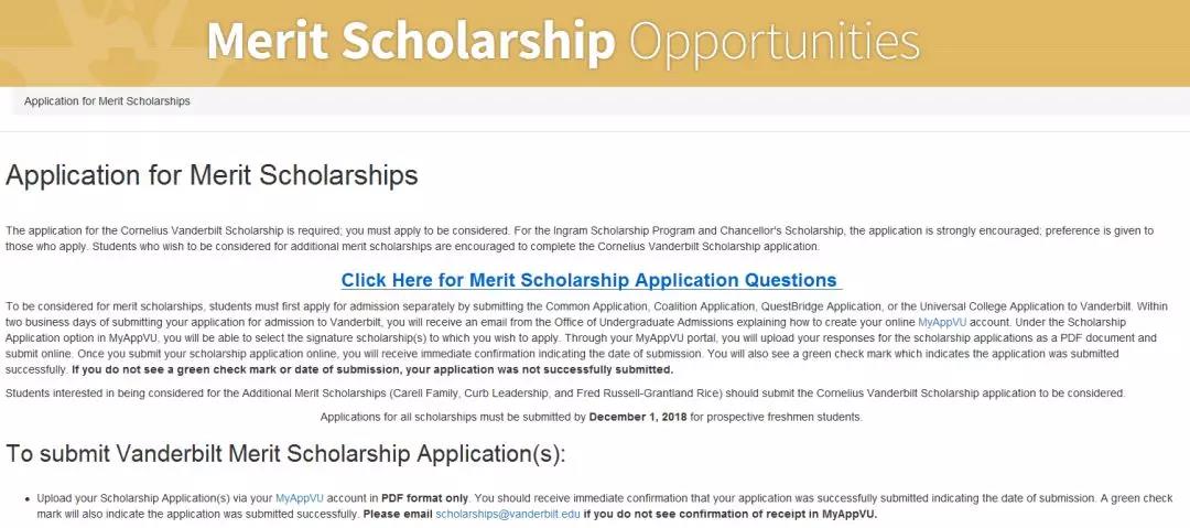 范德堡大学USnews综排14,为2019年攻读本科学位的优秀学生开设Merit-base奖学金,不限国籍,不限专业,奖学金分三种类型,Cornelius Vanerbilt Scholarship、Ingram Scholarship Program、Chancellor’s Scholars。国际生托福不低于100分,雅思不低于7.0。