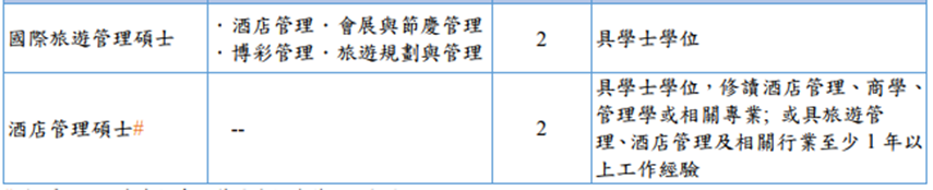 本科:分为三个方向的学士学位方向,国际旅游管理,酒店管理,餐饮管理。 研究生:国际旅游管理硕士学位,一共 2 学年,前 12 个月授课,第二学年实习 + 论文。 该专业为特色专业,国际旅游管理适合转专业申请。 研究生申请标准: