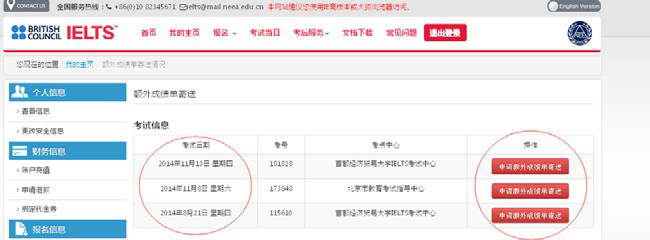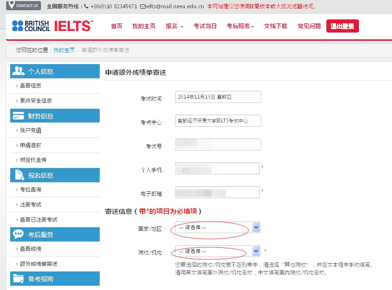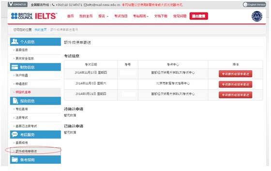 4、 点击上图第二个红圈里相应雅思成绩单的 “申请额外成绩单寄送”,则进入以下页面