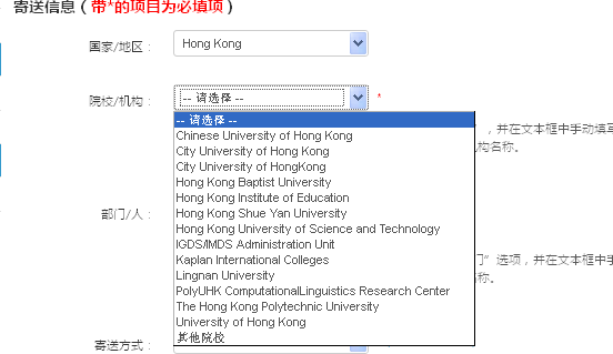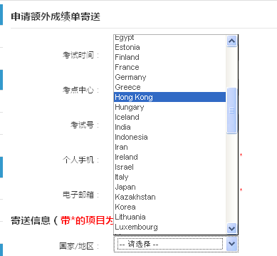 5、 送分给对应大学,则使用 “国家 / 地区 ”的下拉菜单,选择相应国家名称即可