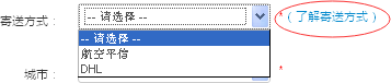 8、 然后在 “寄送方式”的下拉菜单里选择,不同方式的区别 ( 包括范围、费用等 ) 可点击 “了解寄送方式”查询。如下图的圆圈部分
