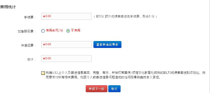 13、 雅思系统会自动计算出送分费用。学生核对费用无误后点击 “提交”
