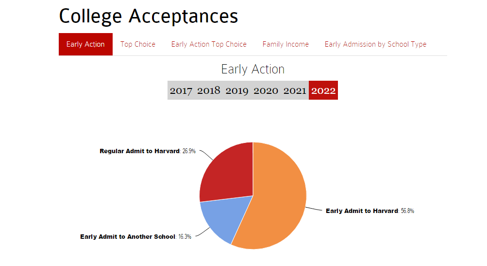 56.8% 的新生是通过早申请被录取的。近五年,每年都有超过 50% 的人走进哈佛。根据哈佛的录取数据, 2022 届学生早申请的录取率为 14.54% ,而整体的录取率却低于 5% 。