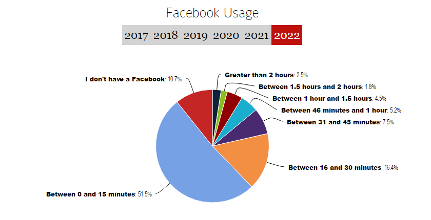 根据调查,很少新生会把时间用在社交媒体上,以 Facebook 的使用时间为例, 51.5% 的学生每天只花 0-15 分钟! 16.4% 学生花 15-30 分钟,仅有 8.8% 的学生会花 1 个小时以上。