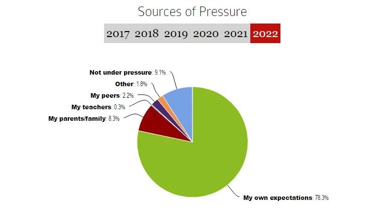 78.3% 的学生认为自己的压力来源于 “ 自我期待 ” ,相比之下, “ 父母期待 ”“ 同辈压力 ” 占比相对较小。可见学霸们强劲的自我驱动力反过来也为自己带来了重重压力。此外,有 21.8% 的学生进行过心理咨询,在近些年,这一比例也在不断上升。