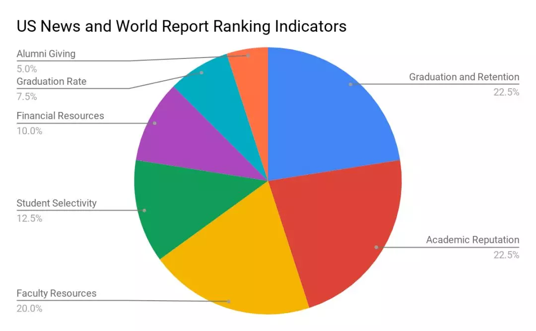 USNEWS世界大学排名是世界四大排名之一,排名是通过13个指标进行分析并统计,通过这13个指标的属性,可以归类成7个考量要素,分别是 学术声誉, 毕业率、师资力量,财力程度、校友捐赠比例、生源质量、毕业率执行情况,最终得出大学的排名。