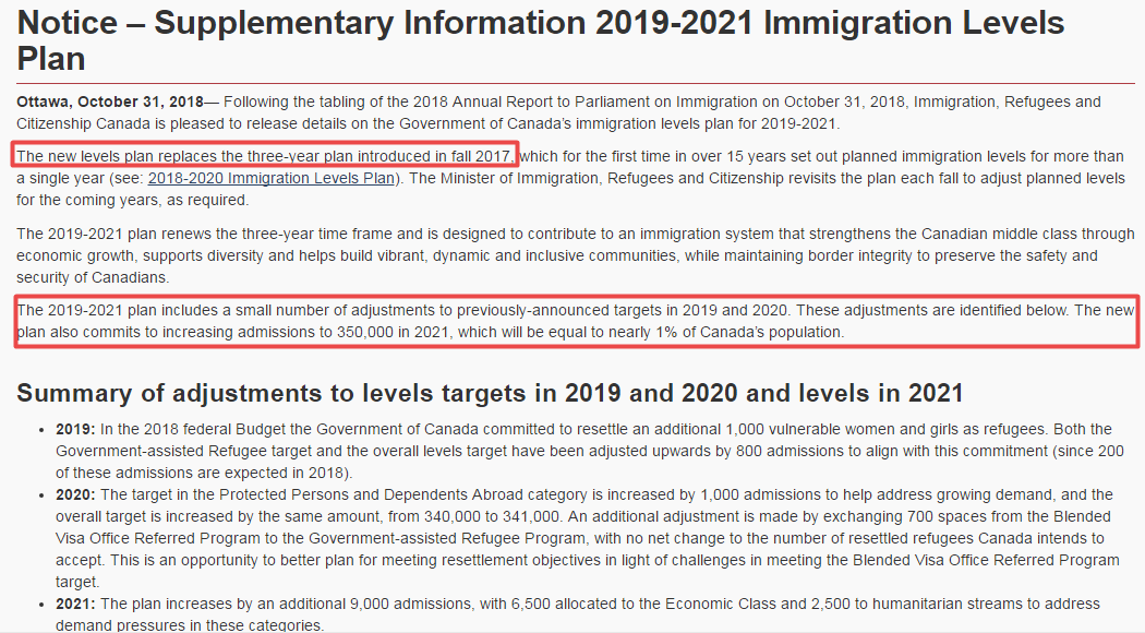 原本在2017年秋季的时候, 加拿大移民局公布了未来三年移民计划是2018年、2019年、2020年共接收98万移民。如今2018年10月31日最新计划变成了2019年、2020年、2021共接收100万移民,首次突破百万大关。移民部长艾哈迈德·胡森也表示,至2021年移民总人数将占加拿大总人口的1%。为了弥补劳动力的日渐短缺和人口老龄化的压力,加拿大仍需要大量移民。