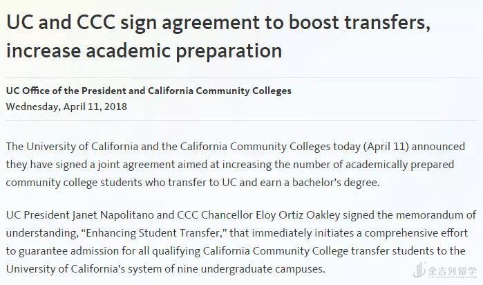 前段时间,University of California加州大学和California Community College加州社区学院这两个大学系统签署了一份“加强学生转学”联合协议,旨在提高加州社区学院成功转入加州大学的学生人数,2019年秋季起,保证所有符合条件的加州社区学院学生能成功转学到加州大学系统9所分校。