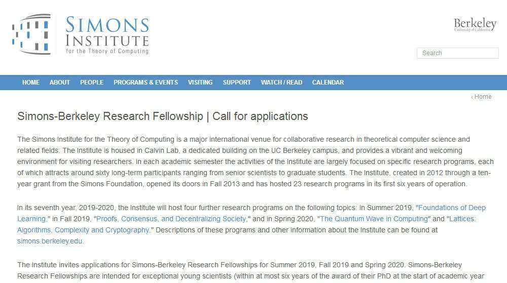 华尔街对冲基金经理、数学家James Simons捐款给母校加州伯克利大学成立西蒙斯计算理论研究所,启动资金高达六千万美金。在研究所中,“世界顶级的计算机理论专家和研究人员将探索计算科学的数学基础,并利用研究成果解决科学领域中的挑战性问题。”现为国际生博士/博士后提供30个奖学金,4个研究主题。 申请截止日期:2018年11月15日(2019夏季学期);2018年12月15日(2019秋季学期/2020春季学期)。