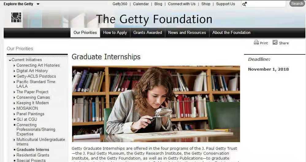 Getty基金会是全世界最大的国际艺术组织之一,该组织的研究中心Getty Center是洛杉矶重要的标志性人文景点,其中藏有众多高质量大师级藏品。基金会现面向国际生开设实习项目,实习领域为视觉艺术相关,有展会、出版、信息管理等工作经验优先。 实习地点在洛杉矶Getty Center或Malibu的Getty Villa。实习为有薪实习,实习时长12个月,从2019.9.9-2020.9.4,共30000刀,另外1000刀安家费,差旅费最高2500刀。 申请截止日期:2018年11月1日