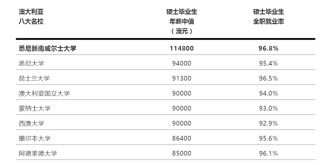 根据澳大利亚政府刚刚公布的《2018毕业生就业情况调查》,悉尼新南威尔士大学硕士毕业生在毕业四年后全职工作的年薪中值傲居全澳第一。在所有“八大名校”中,新南的硕士毕业生无论是就业情况还是收入水平都是佼佼者。整体就业率达96.8%,年薪中值超过11.4万澳元(相当于57.4万元人民币)。不仅全澳第一,在所有八大名校中也遥遥领先。