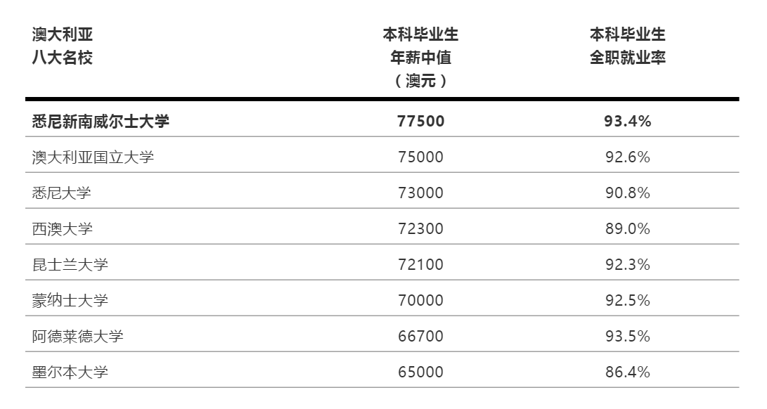 本科毕业生就业情况方面,也是名副其实的领头羊。学生毕业后起薪更高,本科生毕业四年后的整体就业率达93.4%,年薪中值超过7.7万澳元(相当于38.7万元人民币),全澳第二,八大第一。