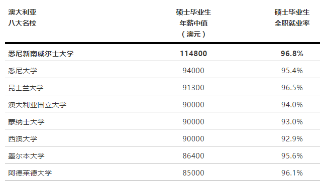 在所有“八大名校”中,新南的硕士毕业生无论是 就业情况 还是 收入水平 都是佼佼者。