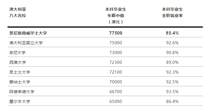 学生 毕业后起薪更高 , 本科生毕业四年后的整体就业率达93.4%,年薪中值超过7.7万澳元(相当于38.7万元人民币), 全澳第二,八大第一 。