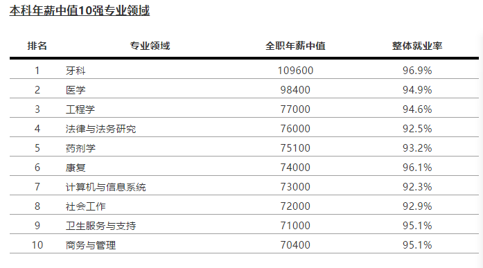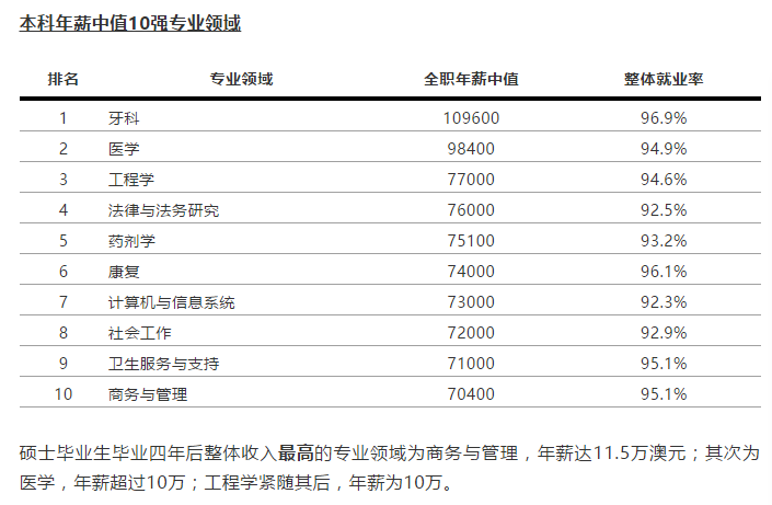 专业领域方面而言,本科毕业生毕业四年后整体收入 最高 的专业领域为牙科,年薪将近11万澳元;其次为医学,年薪超过9.8万澳元。