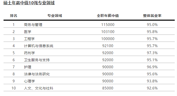 硕士毕业生毕业四年后整体收入 最高的专业领域为商务与管理,年薪达11.5万澳元;其次为医学,年薪超过10万;工程学紧随其后,年薪为10万。