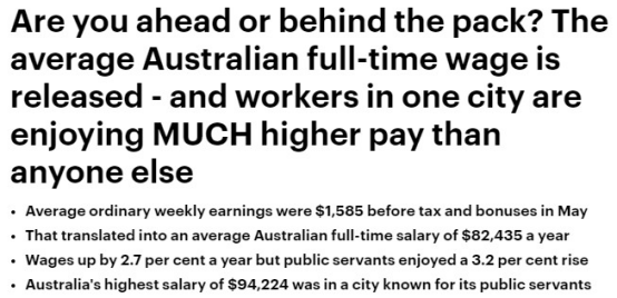 澳洲统计局的数据显示,澳洲全职员工的平均年收入达到了 82435澳元 ,
