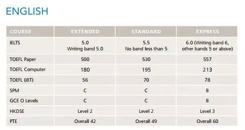 课程入学选择是在考虑学生的背景、英语能力和希望就读的本科课程以及任何其他额外要求之后确定。在这三种课程中,学生可以获得同样高水准的教学。所有课程都包含大学学术英语(AE)和数学两门必修科目,再加上与学生本科目标专业相关的三门选修课。
