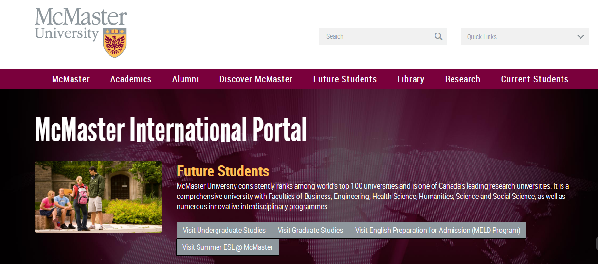 麦克马斯特大学是加拿大安大略省哈密尔顿的一间研究型公立大学,创办于 1887 年。大学设有 6 个学院:理学院、健康科学学院、工程学院、人文科学学院、社会科学学院及商学院。