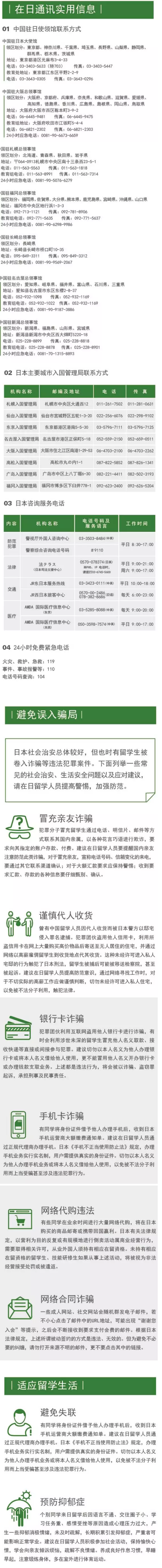 近年,来日留学中国公民不断增多,涉及留学生的领保案件也不断发生。为做好预防性领保工作,增强留学生安全防范意识,提高自我保护能力,中国驻日使馆制作了《中国公民留学日本提示》手册。希望这本手册能为在日留学人员提供帮助。