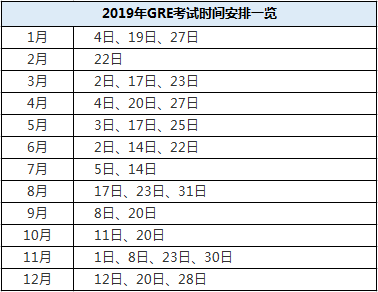 考试成绩有5年有效期,考试次数没有限制,两次考试间隔21天以上即可。最近,ETS官方正式发布了2019年GRE考试日期: