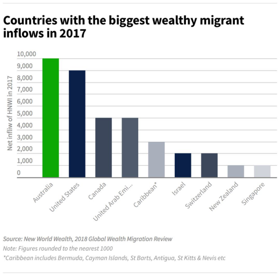 据 New Worl Wealth发布的《2018全球财富移民报告》,在2017年,澳大利亚又一次成为全球高净值移民的首选国家。这也是澳大利亚在该榜单中连续第三年超越美国,涌入了最多的高净值移民。