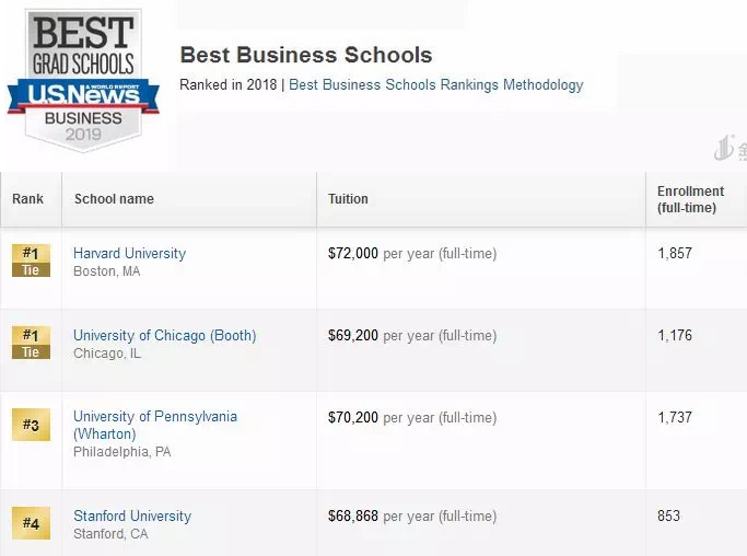 2019年USNew全美最佳研究生商学院Top50名单中:哈佛延续了去年的辉煌,芝加哥大学终于和哈佛大学共同登顶,每所大学的名次变化并不是特别明显,上升下降基本没超过3个名次。 商科排名的依据主要来自以下三个方面:质量评估、学生质量、就业成功率 。