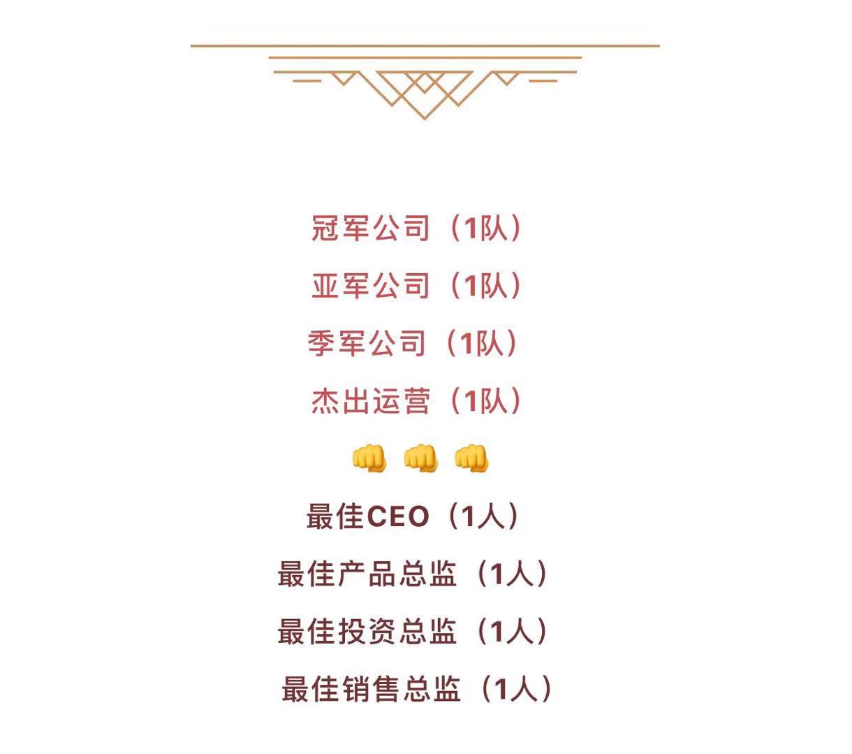 比赛结束之后将评出冠亚季军公司,获得不同的奖励以及证书。同时设立各职务奖项,奖励在该岗位表现出色的个人。