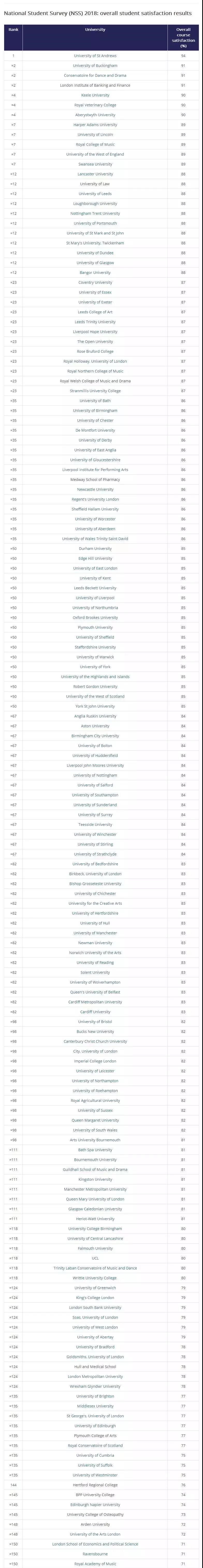 一些大学,如牛津和剑桥大学 ,并未在今年的排名中出现。 这是由于他们并没有达到 排名的准入条件: NSS规定至少必须有50%的该校学生填写调查问卷。