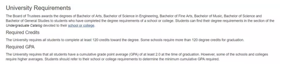 康涅狄格大学要求所有本科的学生需将 Cumulative GPA 保持在 2.0 以上,必须完成至少 120 学分的课程才能获得学士学位,有些学院可能会有更高的要求。学生应参考具体的学院要求,以确定所需的最低累积 GPA 。