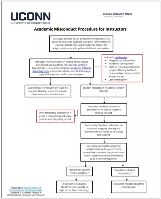 如果教师认为学生违反了学术诚信制度要求,会将学生的行为上报给学校。学校处理流程的第一步是进行 Aministrative Conferences an Investigations. 这个会议是在学校 stuent conuct officer 和学生之间进行的,如果这个 case 可以在这个层面解决,则无需进行下一步流程。如果无法在这个层面解决,学生将会收到 Aministrative Hearing 通知。大家可以从以下的流程图直观地体会一下 University of Connecticut 的处理步骤。