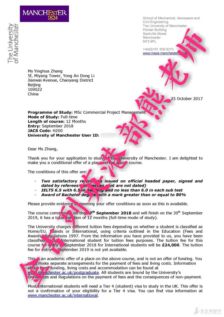 从金吉列留学资深顾问熊老师多年双非院校申请经验来看,专业选择上面是学生能不能拿到满意录取的关键。学生自己本身对于专业这一块没有一个明确的方向,只想着能去英国留学就行。但是根据综合了解学生的留学意向和专业选择这一块,学生自己跟家长这边也愿意去接受,排名靠前的学选择不太热门的专业,排名中等偏上的学校,选择跟学生本身比较符合的商科专业。学生在咨询我的时候,距离递交申请还有一年的时间。根据学生当时的成绩背景,很难想象学生在一年之后可以拿到曼大的录取通知书。曼大作为国内认可度非常高的学校,每年国内很多 211&985 院校的学生都会选择到这所大学继续求学。作为普通二本院校的学生,也有名校梦。所以在剩余的一年留学规划时间,金吉列留学熊老师积极给学生分析院校申请思路,选择专业,背景提升。终于学生从咨询的时候均分 80 分左右,到申请时均分 85 分,中间是学生和金吉列留学熊老师互相配合促进的结果。学生申请材料准备齐全之后,金吉列留学运用 1+8 的服务模式,文案老师,外联老师积极为学生的申请保驾护航。最后,在学生递交曼大申请一个月左右时间,学生顺利拿到了心仪的曼大录取通知书!!!