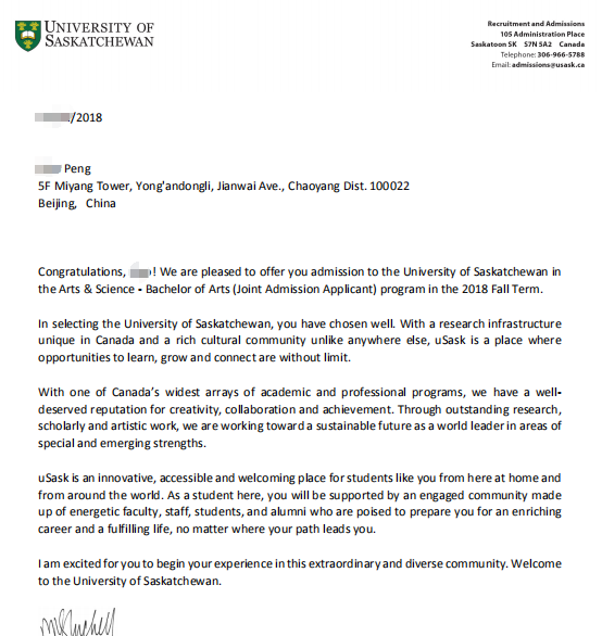 学生找到金吉列留学老师的时候其实时间已经比较紧张了,由于学校没有提供相应的服务,所以很快开始办理。从开始准备申请学校材料就体现了我们的专业度和顾问的耐心度。因为涉及到转学分,就会有课程描述的材料问题;由于是大学在读,也需要相应提供高中的一系列材料。后期再帮忙翻译,到先拿到语言的录取。在学生比较高配合的合作下, 3 个月内拿到了语言的录取。正课录取过程中,由于涉及转学分,对于这个材料的准备萨省大学的审核也是非常严格,在我们的帮助下也顺利完成。如今彭同学已经顺利获签,希望彭同学一切顺利,学有所成!