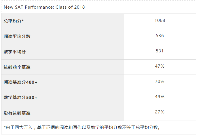 报告显示: 2018年届考生SAT平均成绩为 1068分 ,比去年的平均 1060分略有增加。阅读平均分为 536分 ,数学部分为 531分 , 2017届考生阅读平均 533分 ,数学平均 527分 ,均有提升。
