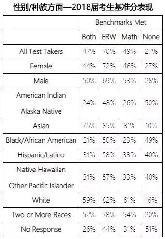 比如 2018届考生的SAT的数学基准分是 530分 , SAT阅读的基准分是 480分 。阅读单项超过基准分的考生达到 70% ,数学单项超过基准分的考生只有 49% ,数据表明,有超过半数的考生数学是达不到基准分的,但为什么分数会这么高呢,后面会有数据证明: 是亚洲考生把平均分给拉上来的 。