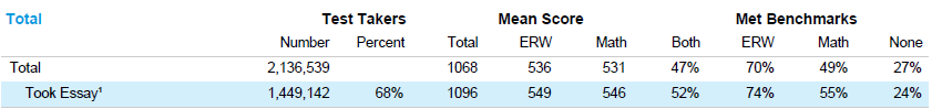 数学和阅读都超过基准分的考生有 47% ,也就是说,如果你阅读 480分,数学530分,就已经超过了全球53%的考生了。这一比例在2017届毕业生达到 46% ,显然,这届考生武力值 +1 。