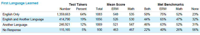 母语是英语的考生,在 SAT分数上有一点优势,但差距不是很大,这里还主要是亚洲学霸的实力体现。
