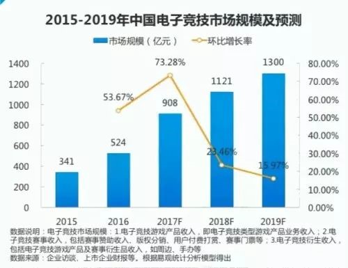 预计在2018年,中国电子竞技市场规模突破千亿大关,达到1121亿。2019年,中国电子竞技市场规模将达到1300亿。