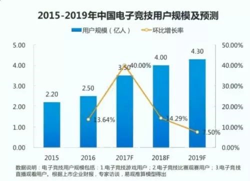 2017年我国电子竞技用户将达到3.5亿,环比增长40%,预计2019年将达到4.3亿人。