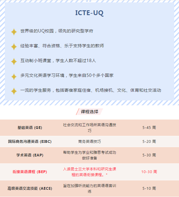 昆士兰大学继续教育与 TESOL教育学院(ICTE-UQ)于1981年成立, 是昆士兰州首个也是历史最悠久的一个政府认证的英语语言学院,位于昆士兰大学主校区 St Lucia内。