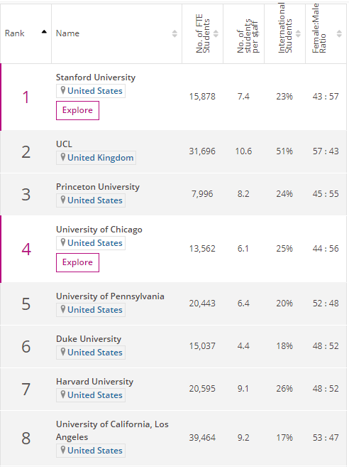 此次,THE公布了463所心理学专业的最佳大学。斯坦福大学 在2019年的排名中名列第一,其次是 伦敦大学学院, 英国有两所大学排名前十(伦敦政治与经济学院排名第9)