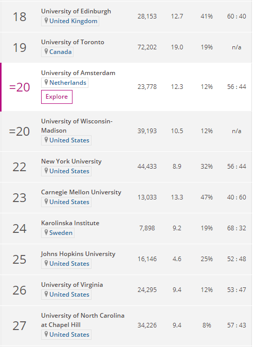 总排名中,有超过四分之一的大学(136所大学)是美国的大学,数量排名第二的国家是英国,有69所大学。澳大利亚,德国和加拿大也有很好的成绩,分别有28,26和24所大学。