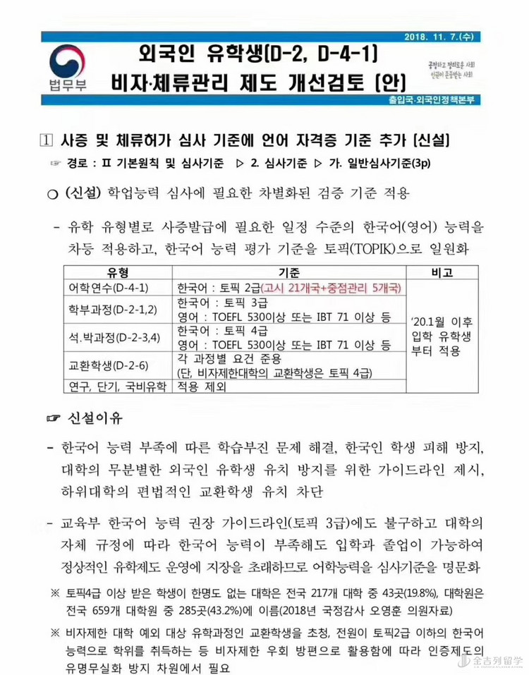 公示文件重点内容如下: 从2020年1月开始,韩国留学签证发放审查会增加语言资格证基准。 D-4-1语言签证发放需要提交韩语TOPIK 2级以上成绩(此项规定针对于公示21国和重点管理5国,中国在公示21国名单中) D-2-1,2 本科签证发放需要提交TOPIK 3级以上成绩(或TOEFL 530以上,IBT 71以上) D-2-3,4 研究生签证发放需要提交TOPIK 4级以上成绩(或TOEFL 530以上 ,IBT 71以上) D-2-6 交换生签证发放根据个别学科基准提交韩语成绩(但被限制签证的大学的交换生需要TOPIK4级)