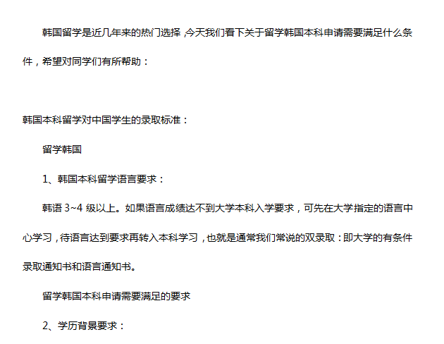 韩国留学是近几年来的热门选择,今天我们看下关于留学韩国本科申请需要满足什么条件,希望对同学们有所帮助: