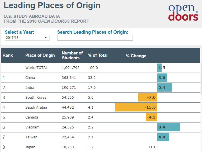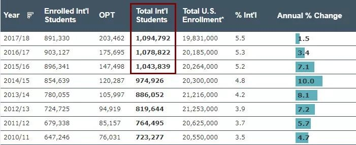 2017-2018学年,去美国读书的国际生数量高达 1,094,792 人,这已是美国连续第三年留学人数破百万。