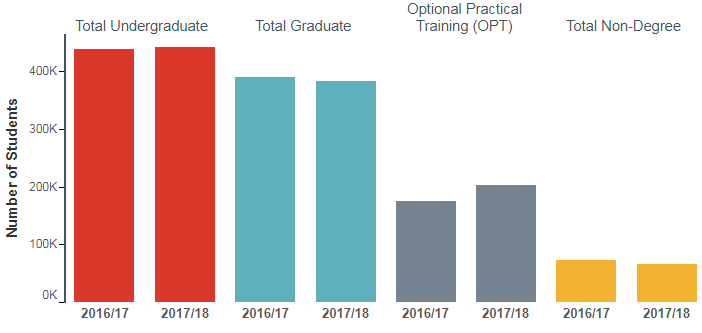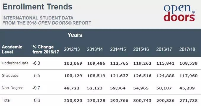 2016-2017学年的国际新生数量是12年来首次减少 3% ,大约 10000名新生。然而,在2017-2018学年,悲剧再次上演, 国际新生数量仅为 271,738 ,下降了 6.6%。