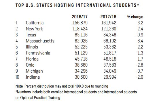 纽约、 马萨诸塞州 的留学生人数也在增长,尽管德州没有增长,但依然排在第三位,前十名的还有 伊利诺伊州、宾州、佛罗里达州、俄亥俄州、密歇根州和印第安纳州 。